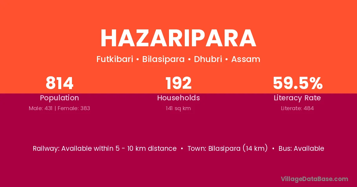 Bilasipara (14 km) is the nearest town to Hazaripara village for major economic activities and is located approximately 14 km away.
