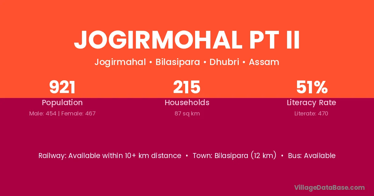 Bilasipara (12 km) is the nearest town to Jogirmohal Pt Ii village for major economic activities and is located approximately 12 km away.