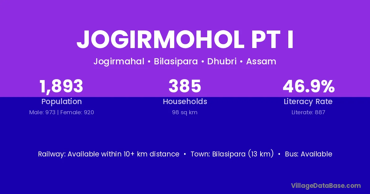 Bilasipara (13 km) is the nearest town to Jogirmohol Pt I village for major economic activities and is located approximately 13 km away.