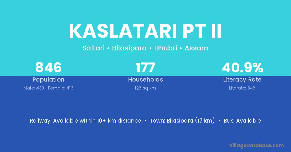 Bilasipara (17 km) is the nearest town to Kaslatari Pt Ii village for major economic activities and is located approximately 17 km away.