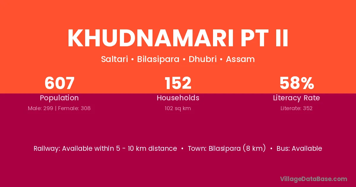 Bilasipara (8 km) is the nearest town to Khudnamari Pt Ii village for major economic activities and is located approximately 8 km away.