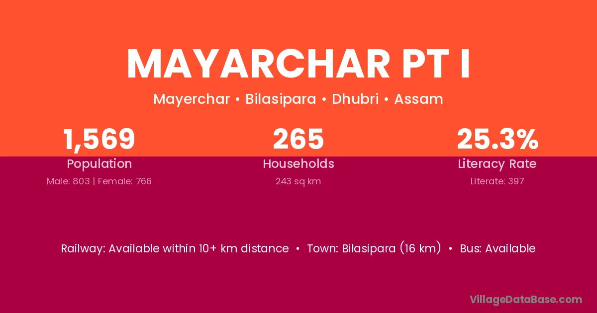 Bilasipara (16 km) is the nearest town to Mayarchar Pt I village for major economic activities and is located approximately 16 km away.