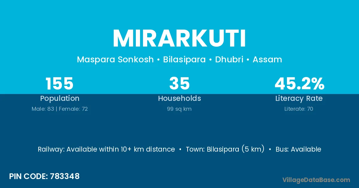 Bilasipara (5 km) is the nearest town to Mirarkuti village for major economic activities and is located approximately 5 km away.