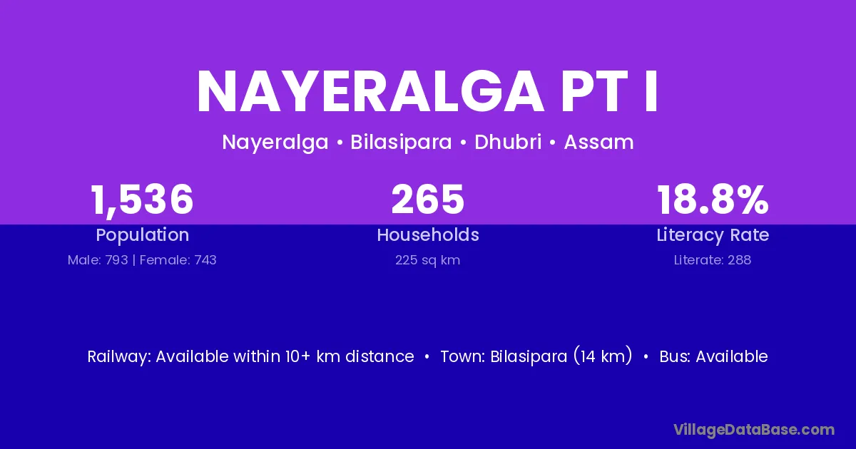 Bilasipara (14 km) is the nearest town to Nayeralga Pt I village for major economic activities and is located approximately 14 km away.