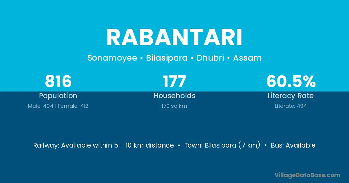 Bilasipara (7 km) is the nearest town to Rabantari village for major economic activities and is located approximately 7 km away.