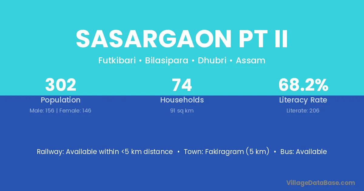 Sasargaon Pt Ii village has a total population of 302 people, of which 156 are males and 146 are females.