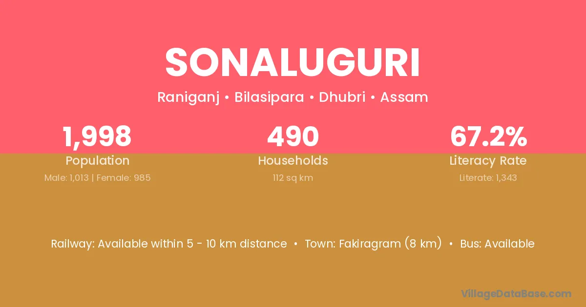Fakiragram (8 km) is the nearest town to Sonaluguri village for major economic activities and is located approximately 8 km away.