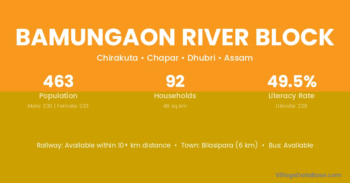Bilasipara (6 km) is the nearest town to Bamungaon River Block village for major economic activities and is located approximately 6 km away.