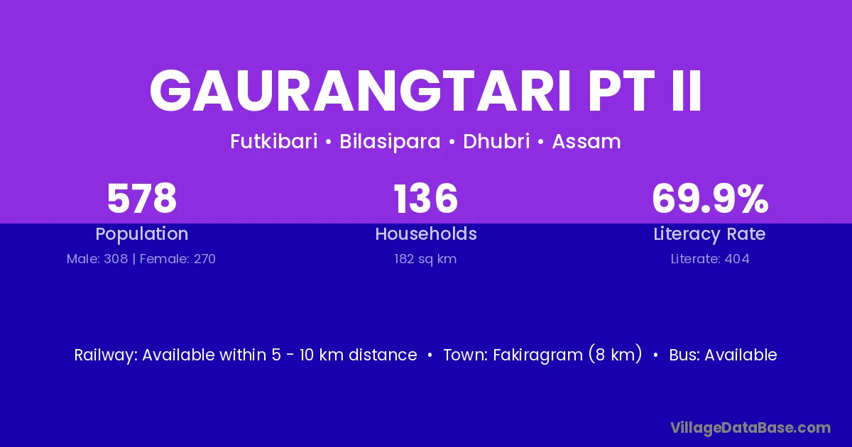 Chapar (21 km) is the nearest town to Gaurangtari Pt Ii village for major economic activities and is located approximately 21 km away.
