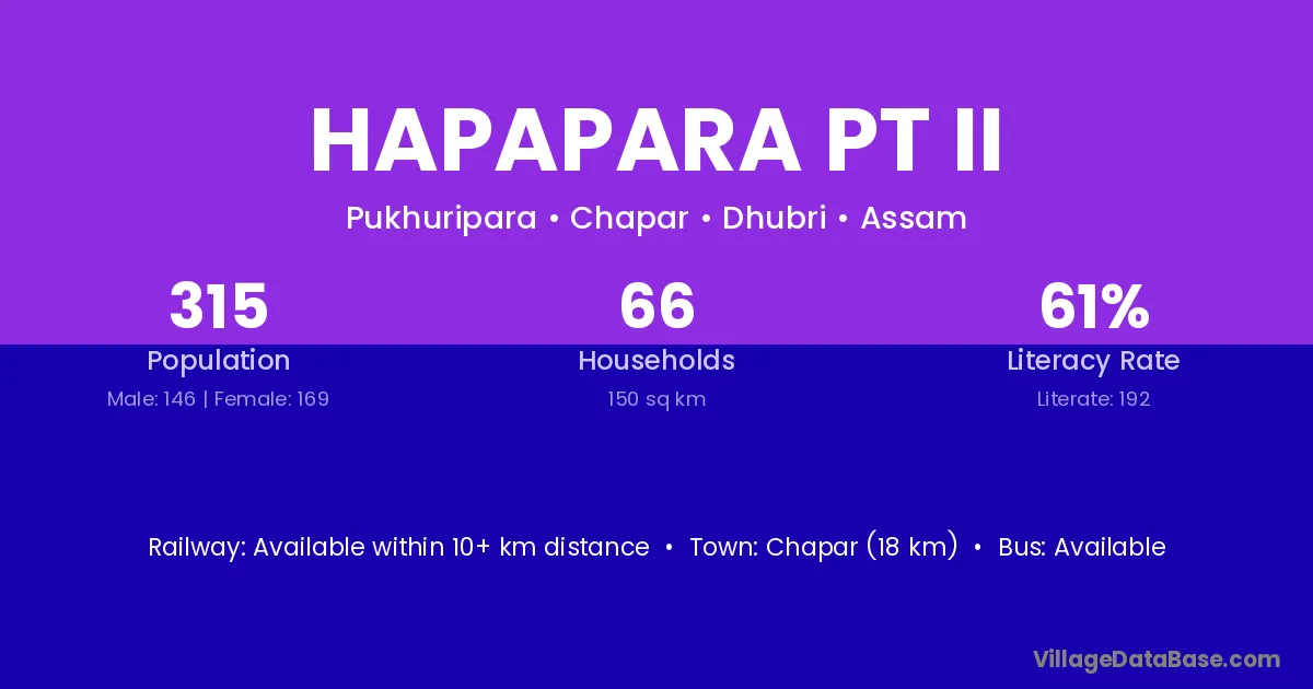 Chapar (18 km) is the nearest town to Hapapara Pt Ii village for major economic activities and is located approximately 18 km away.