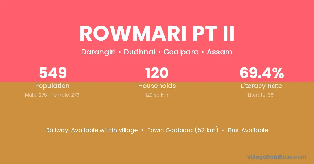 Chapar (4 km) is the nearest town to Rowmari Pt Ii village for major economic activities and is located approximately 4 km away.