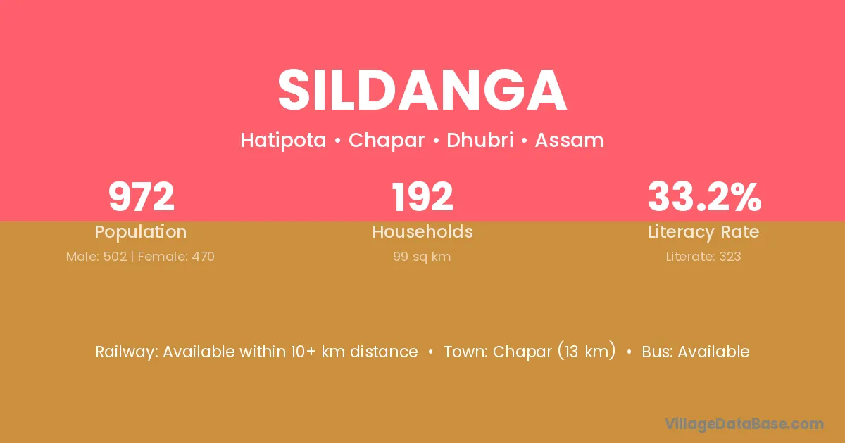 Chapar (13 km) is the nearest town to Sildanga village for major economic activities and is located approximately 13 km away.