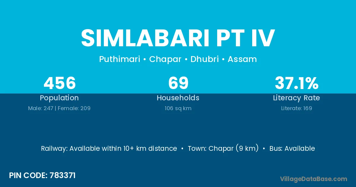 Chapar (9 km) is the nearest town to Simlabari Pt Iv village for major economic activities and is located approximately 9 km away.