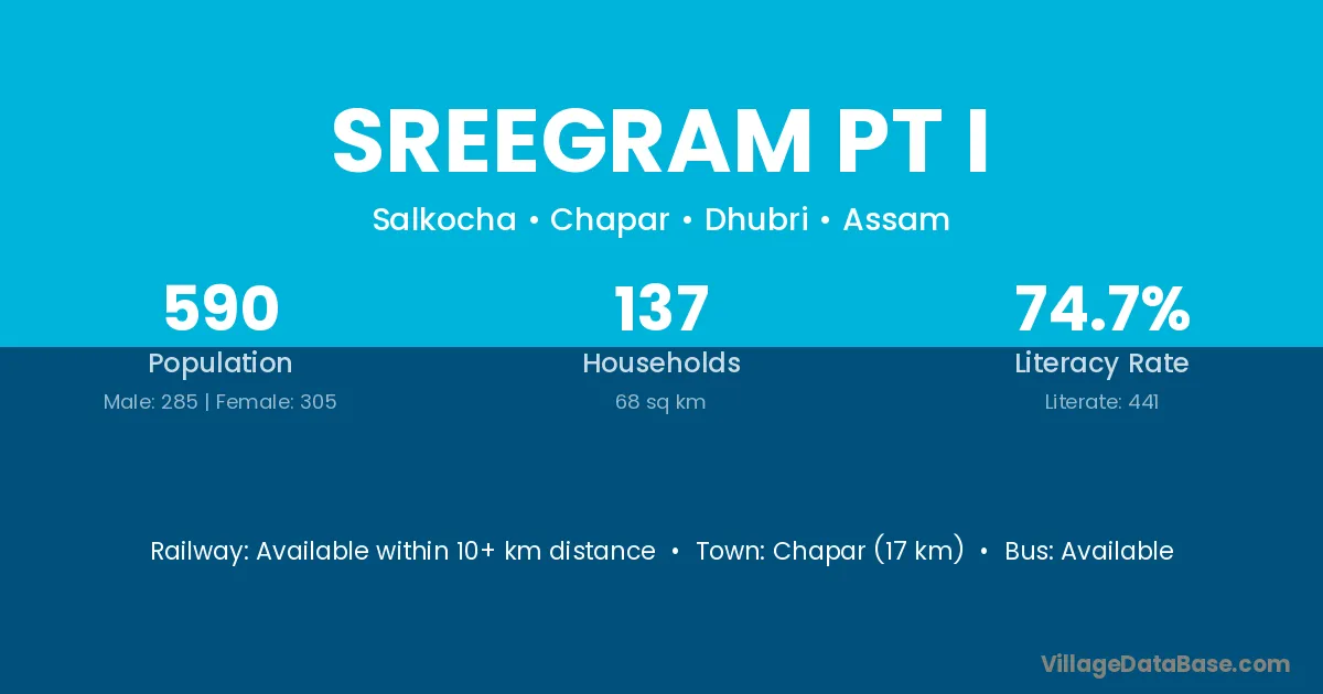 Chapar (17 km) is the nearest town to Sreegram Pt I village for major economic activities and is located approximately 17 km away.