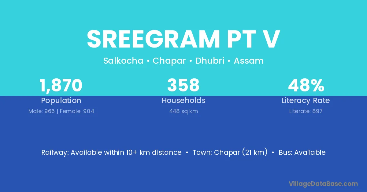 Chapar (21 km) is the nearest town to Sreegram Pt V village for major economic activities and is located approximately 21 km away.
