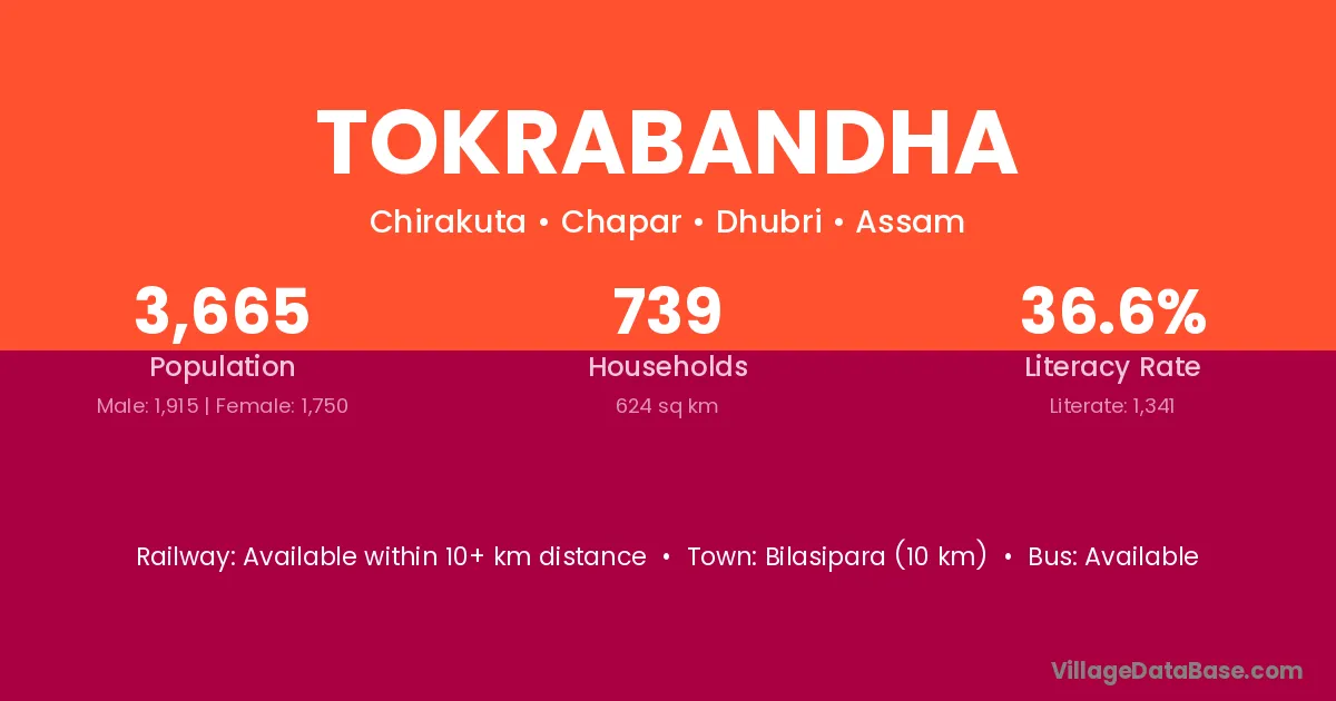 Bilasipara (10 km) is the nearest town to Tokrabandha village for major economic activities and is located approximately 10 km away.