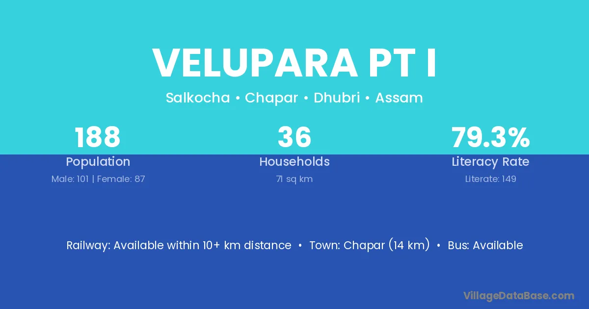 Chapar (14 km) is the nearest town to Velupara Pt I village for major economic activities and is located approximately 14 km away.