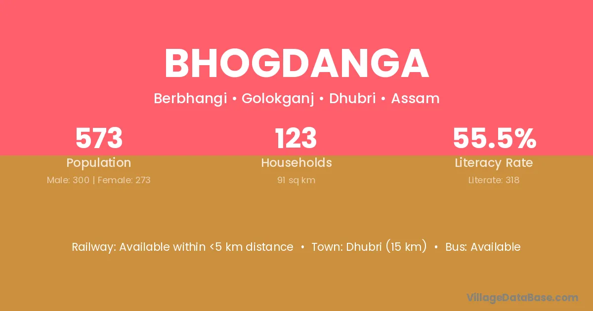 Dhubri (15 km) is the nearest town to Bhogdanga village for major economic activities and is located approximately 15 km away.