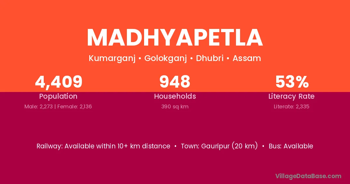 Gauripur (20 km) is the nearest town to Madhyapetla village for major economic activities and is located approximately 20 km away.