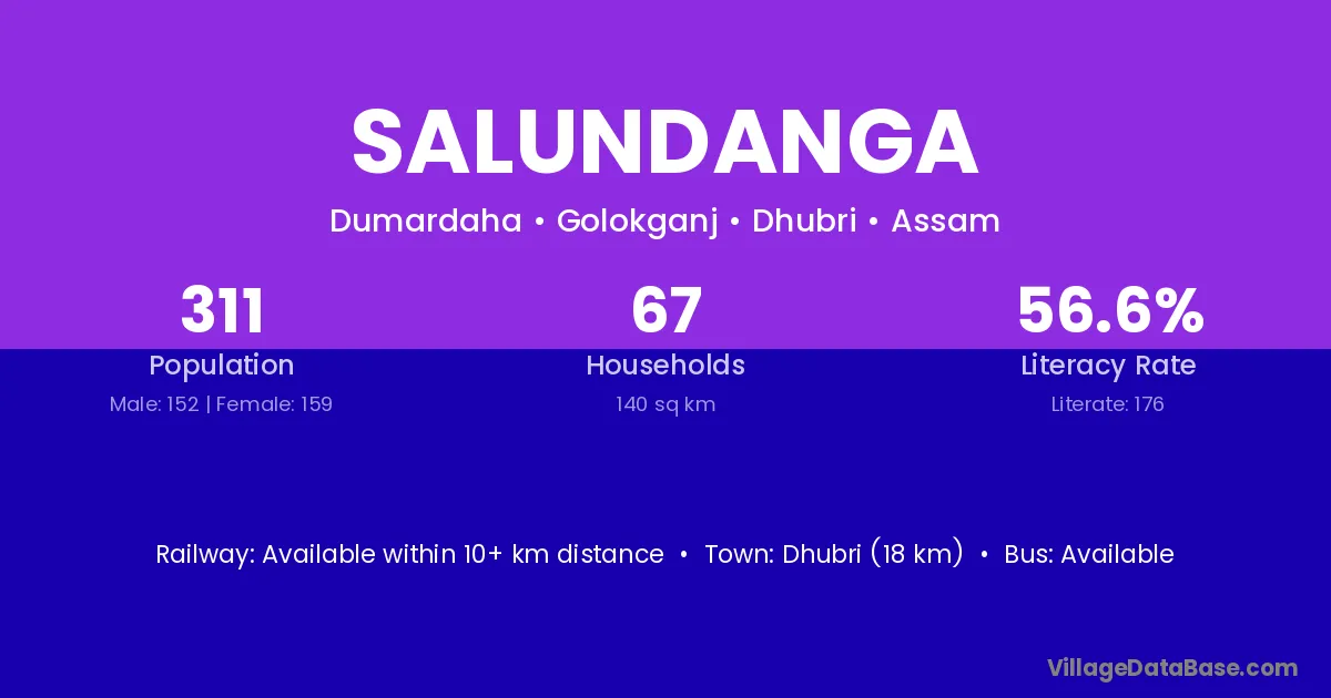 Dhubri (18 km) is the nearest town to Salundanga village for major economic activities and is located approximately 18 km away.