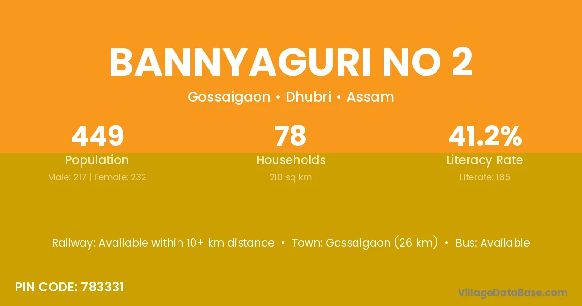 Bannyaguri No 2 village has a total population of 449 people, of which 217 are males and 232 are females.