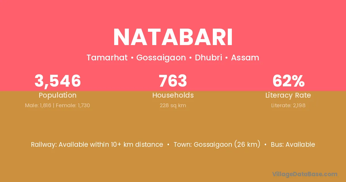 Gossaigaon (26 km) is the nearest town to Natabari village for major economic activities and is located approximately 26 km away.