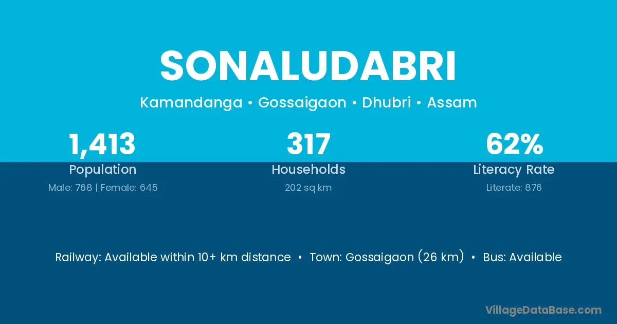 Gossaigaon (26 km) is the nearest town to Sonaludabri village for major economic activities and is located approximately 26 km away.