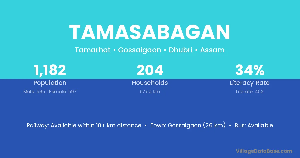 Gossaigaon (26 km) is the nearest town to Tamasabagan village for major economic activities and is located approximately 26 km away.