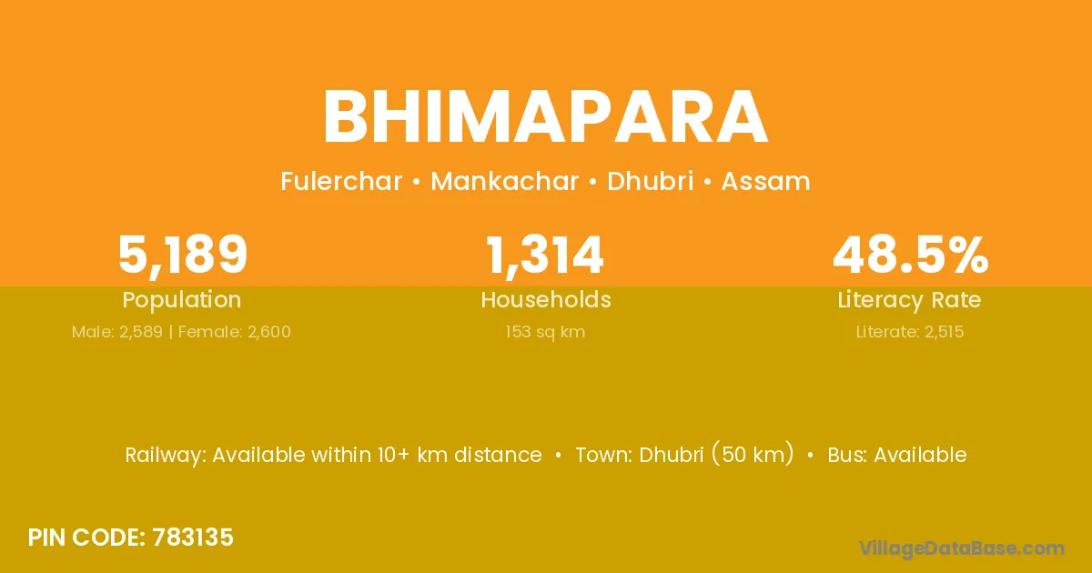 Dhubri (50 km) is the nearest town to Bhimapara village for major economic activities and is located approximately 50 km away.
