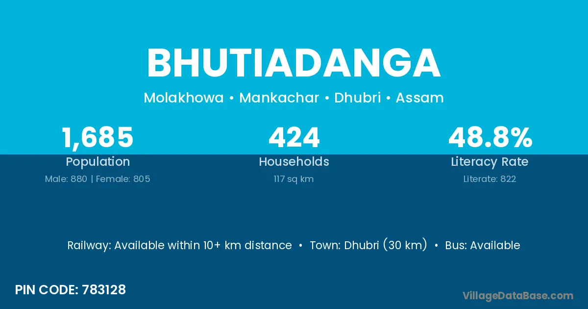 Dhubri (30 km) is the nearest town to Bhutiadanga village for major economic activities and is located approximately 30 km away.