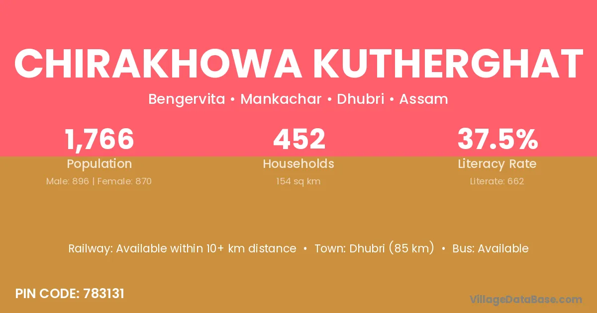 Dhubri (85 km) is the nearest town to Chirakhowa Kutherghat village for major economic activities and is located approximately 85 km away.