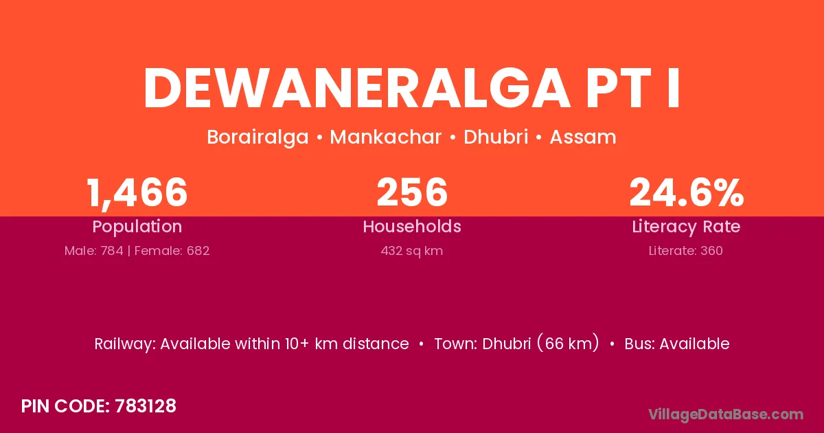 Dhubri (66 km) is the nearest town to Dewaneralga Pt I village for major economic activities and is located approximately 66 km away.