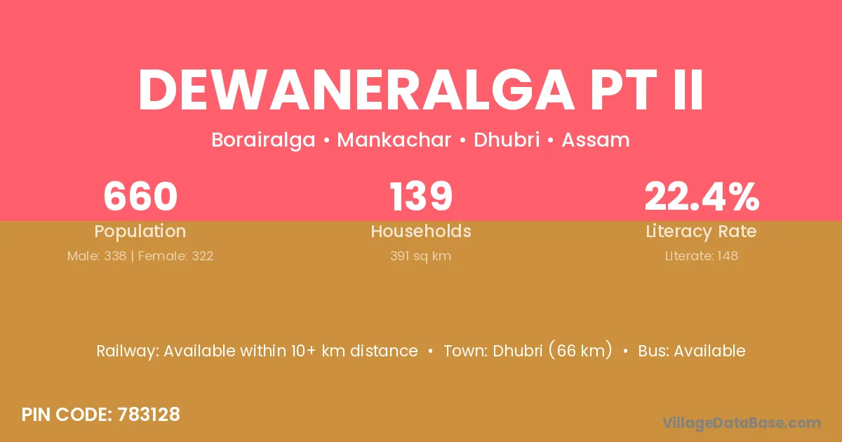 Dhubri (66 km) is the nearest town to Dewaneralga Pt Ii village for major economic activities and is located approximately 66 km away.