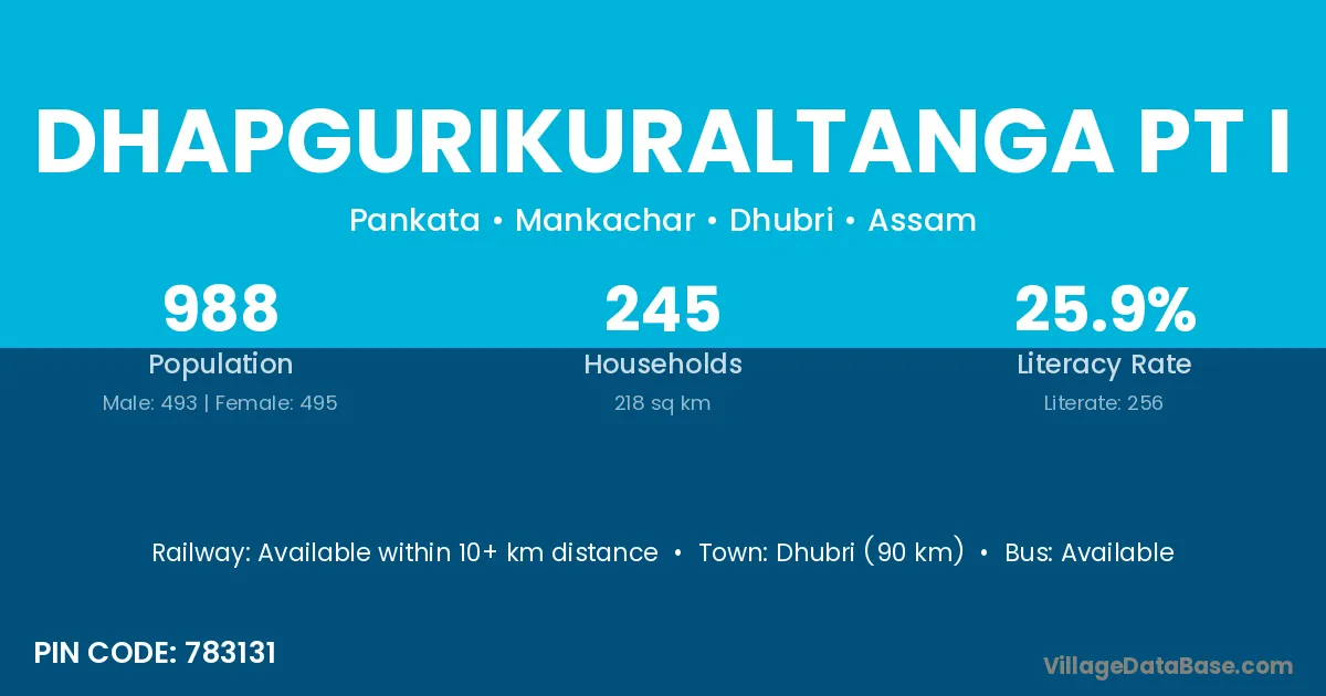 Dhubri (90 km) is the nearest town to Dhapgurikuraltanga Pt I village for major economic activities and is located approximately 90 km away.