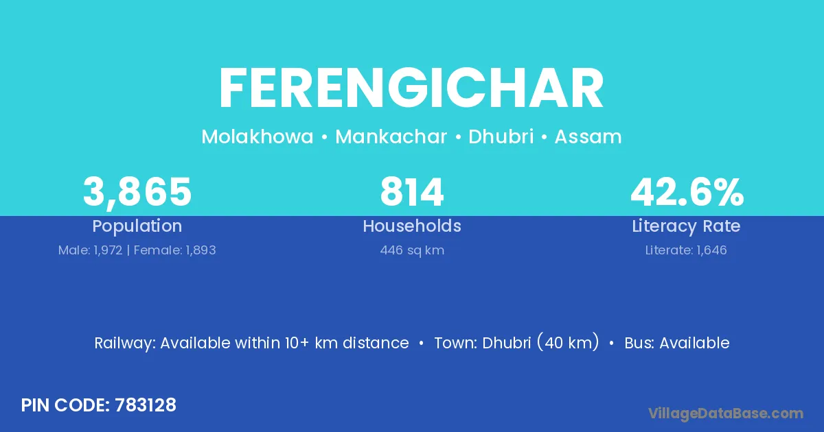 Dhubri (40 km) is the nearest town to Ferengichar village for major economic activities and is located approximately 40 km away.