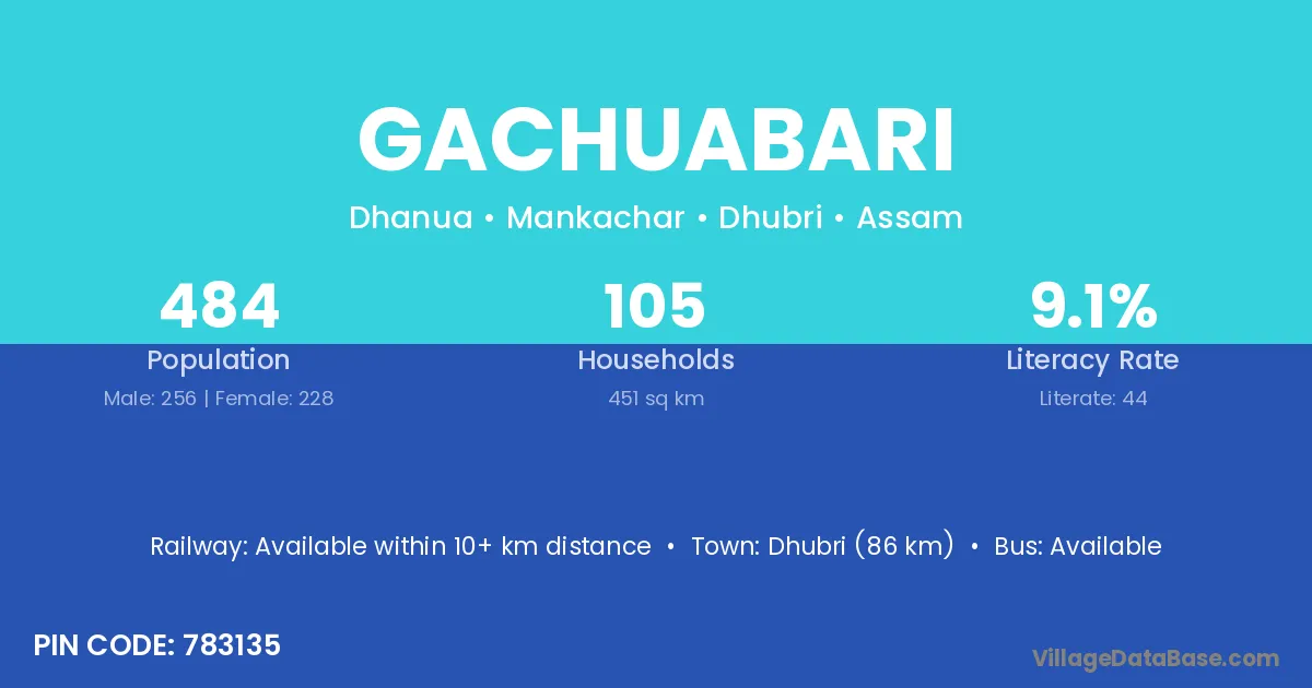 Dhubri (86 km) is the nearest town to Gachuabari village for major economic activities and is located approximately 86 km away.