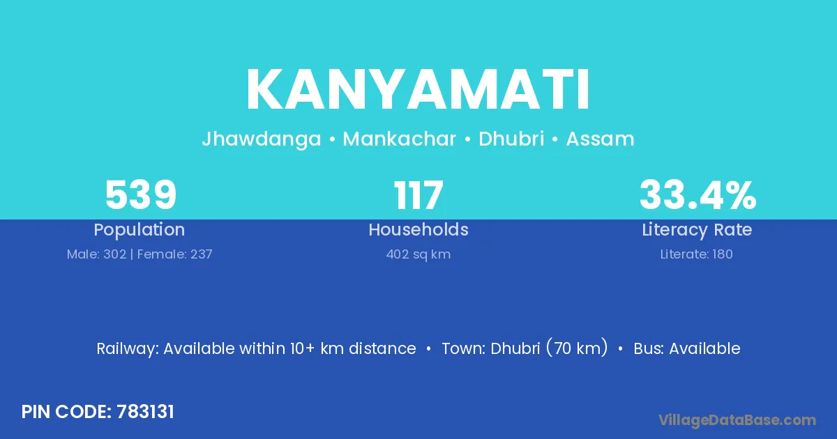 Dhubri (70 km) is the nearest town to Kanyamati village for major economic activities and is located approximately 70 km away.