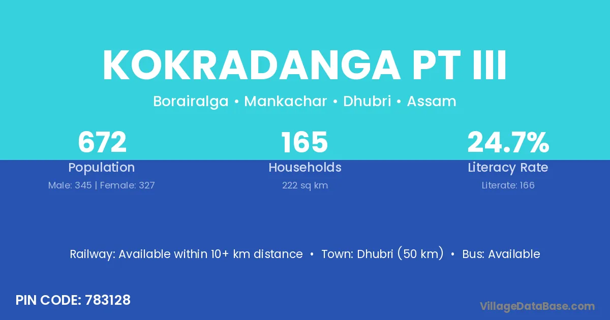Dhubri (50 km) is the nearest town to Kokradanga Pt Iii village for major economic activities and is located approximately 50 km away.