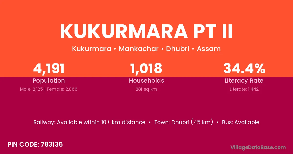 Dhubri (45 km) is the nearest town to Kukurmara Pt Ii village for major economic activities and is located approximately 45 km away.