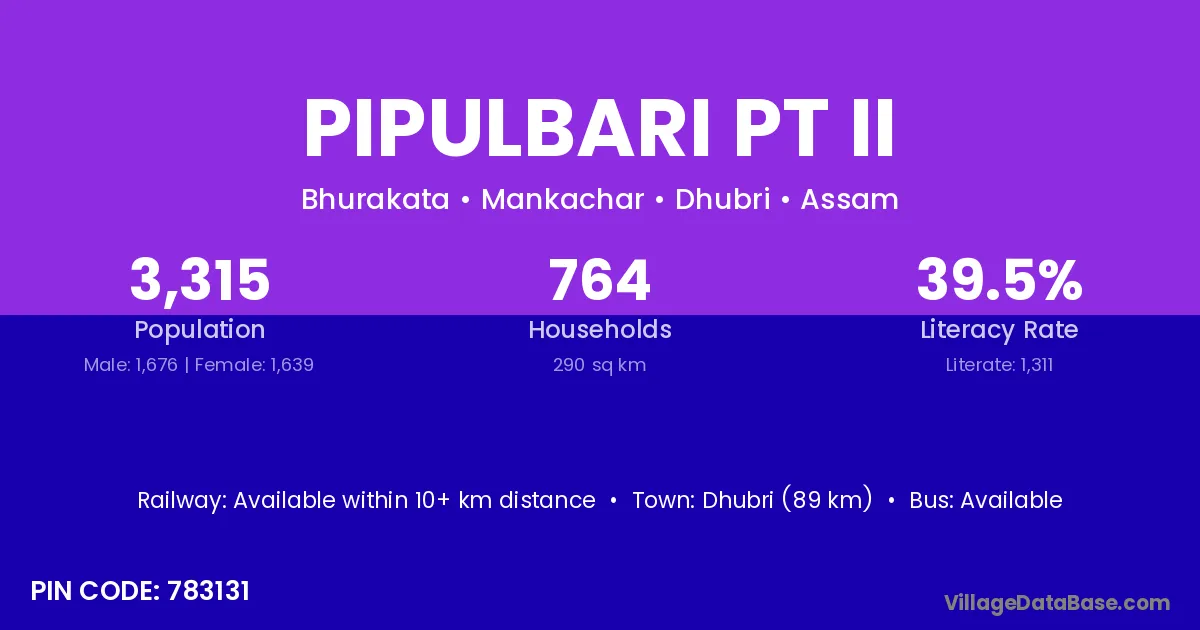 Dhubri (89 km) is the nearest town to Pipulbari Pt Ii village for major economic activities and is located approximately 89 km away.