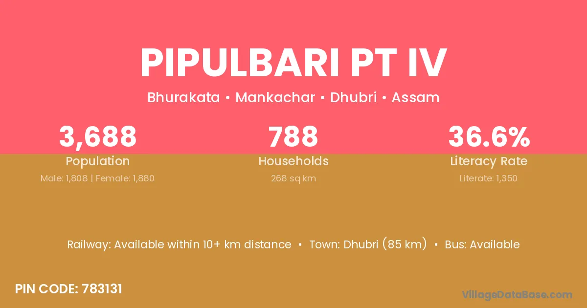 Dhubri (85 km) is the nearest town to Pipulbari Pt Iv village for major economic activities and is located approximately 85 km away.
