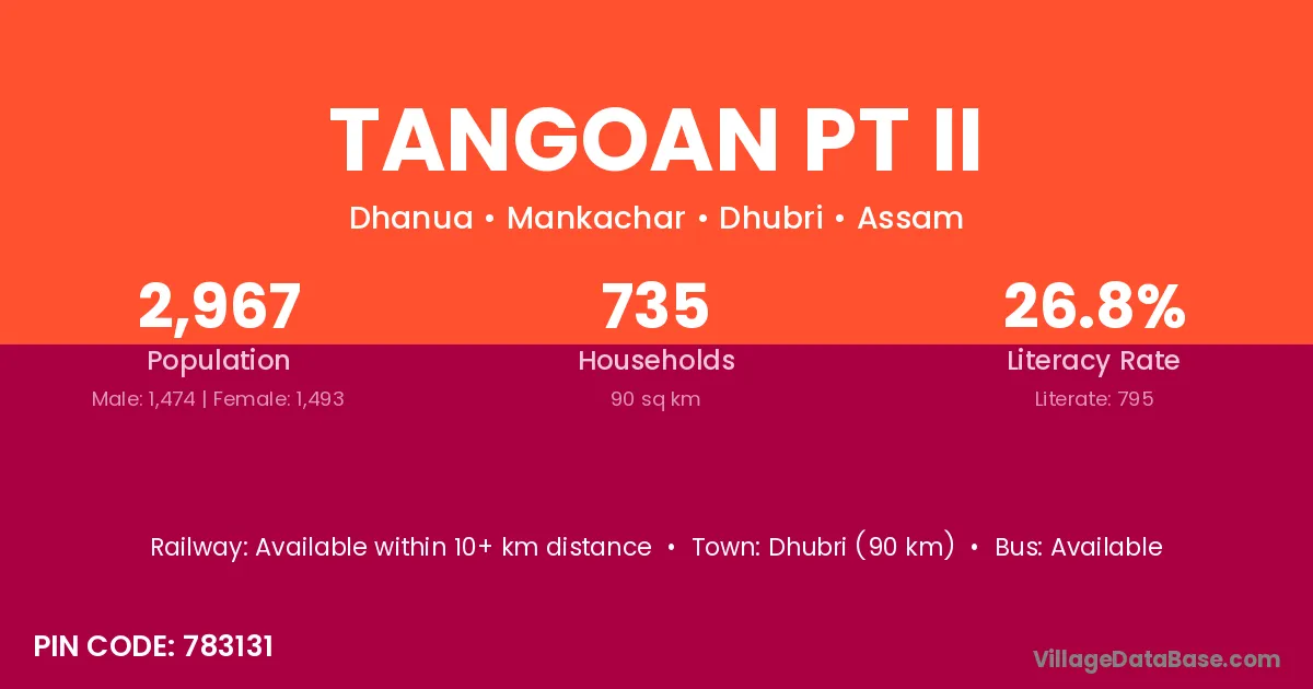 Dhubri (90 km) is the nearest town to Tangoan Pt Ii village for major economic activities and is located approximately 90 km away.