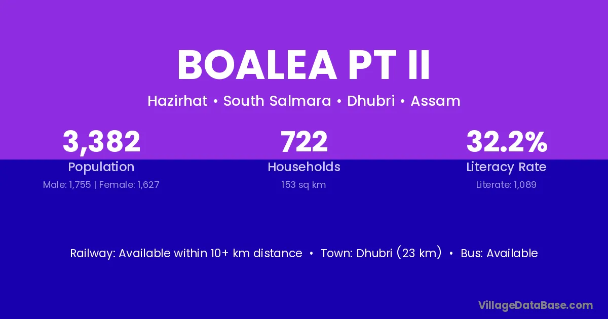Dhubri (23 km) is the nearest town to Boalea Pt Ii village for major economic activities and is located approximately 23 km away.