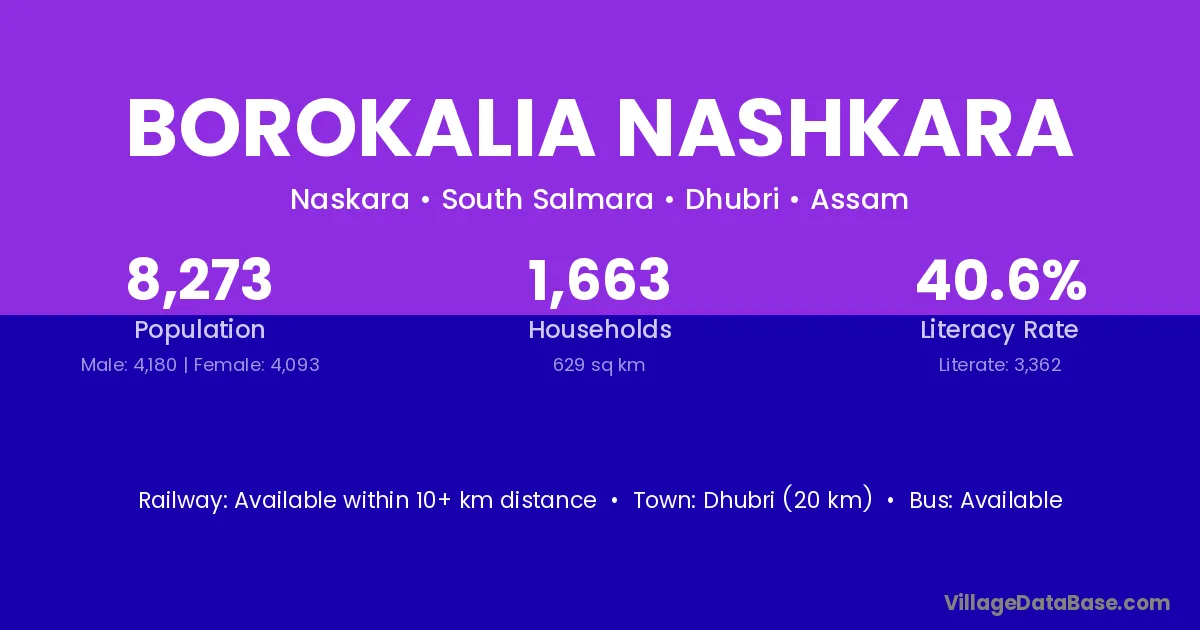 Dhubri (20 km) is the nearest town to Borokalia Nashkara village for major economic activities and is located approximately 20 km away.