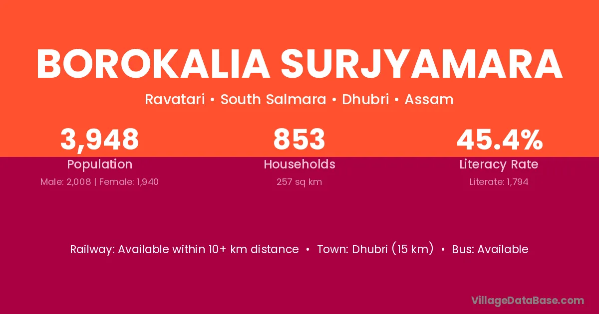 Dhubri (15 km) is the nearest town to Borokalia Surjyamara village for major economic activities and is located approximately 15 km away.