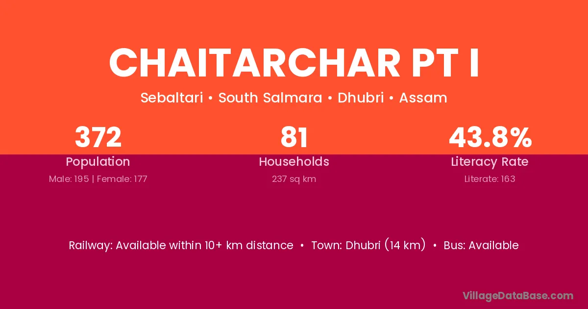 Dhubri (14 km) is the nearest town to Chaitarchar Pt I village for major economic activities and is located approximately 14 km away.