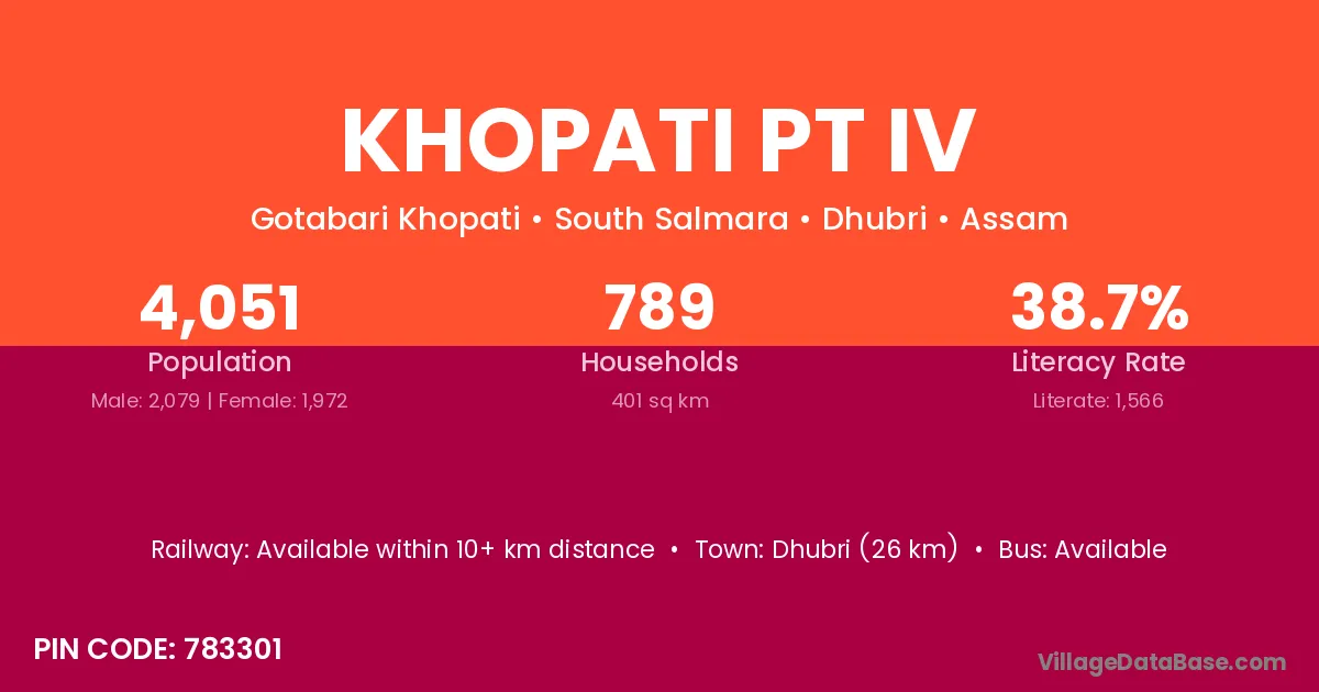 Dhubri (26 km) is the nearest town to Khopati Pt Iv village for major economic activities and is located approximately 26 km away.