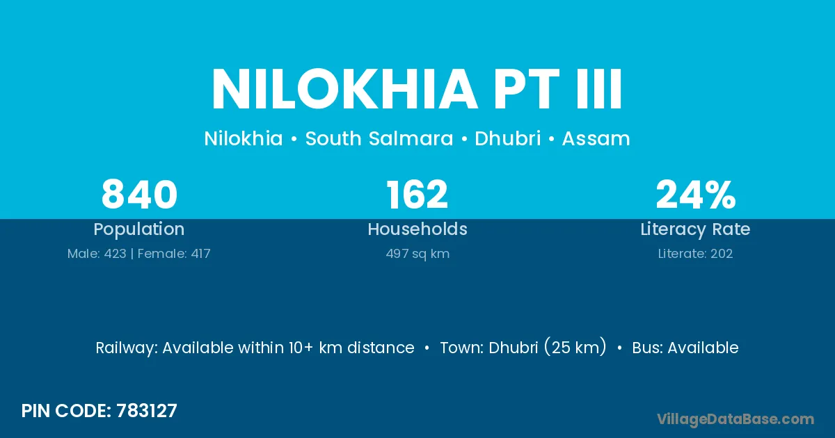 Dhubri (25 km) is the nearest town to Nilokhia Pt Iii village for major economic activities and is located approximately 25 km away.
