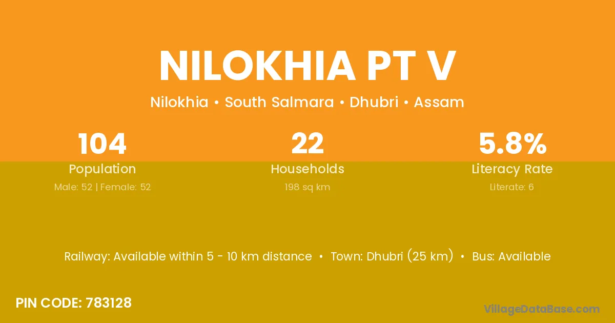 Dhubri (25 km) is the nearest town to Nilokhia Pt V village for major economic activities and is located approximately 25 km away.