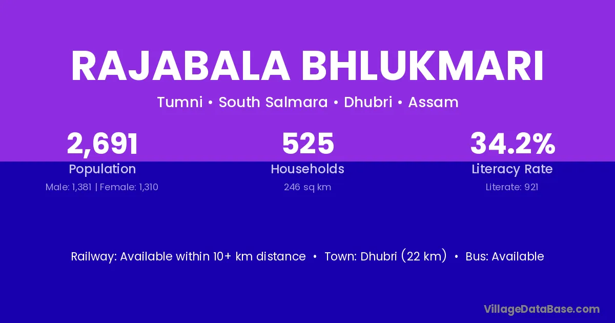 Dhubri (22 km) is the nearest town to Rajabala Bhlukmari village for major economic activities and is located approximately 22 km away.
